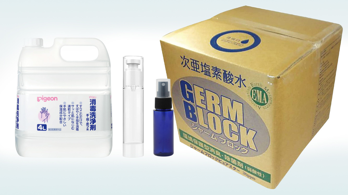 日本製の消毒用アルコールと弱酸性次亜塩素酸水を専用ボトルに入れて、従業員の各家庭に人数分を配布